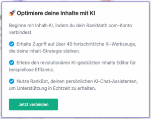 Die Nutzung setzt ein verbundenes RankMath.com-Konto voraus. Sichtbarkeit in klassischen Suchmaschinen bleibt weiterhin das Hauptziel – die Auswirkungen auf KI-Antwortsysteme sind aktuell nicht abschätzbar, da es noch keine garantierten Schnittstellen oder Standards wie llms.txt im produktiven Einsatz gibt.