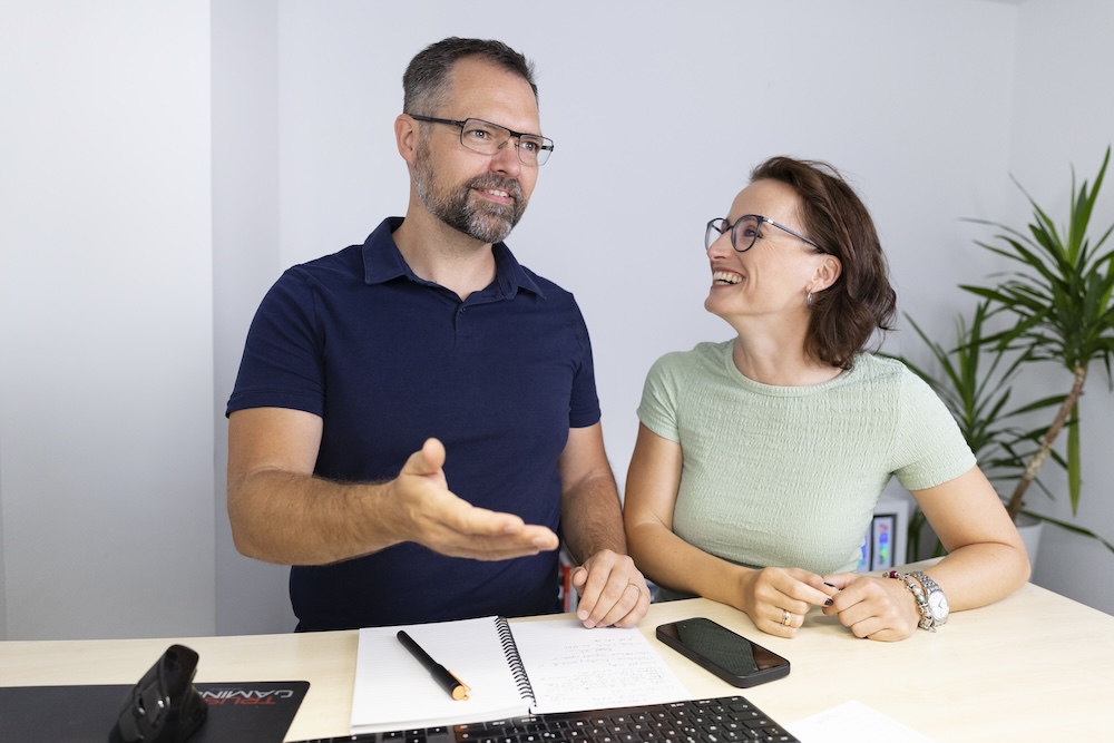 Ich weiß, viele können sich das gar nicht vorstellen: mit dem eigenen Partner arbeiten. Aber bei uns klappt das richtig gut – vielleicht gerade, weil wir so unterschiedlich sind und jeder seinen Bereich hat. Marcus kümmert sich um die Strategie, ich übernehme die Gestaltung und Inhalte. Wir ergänzen uns, statt uns in die Quere zu kommen.